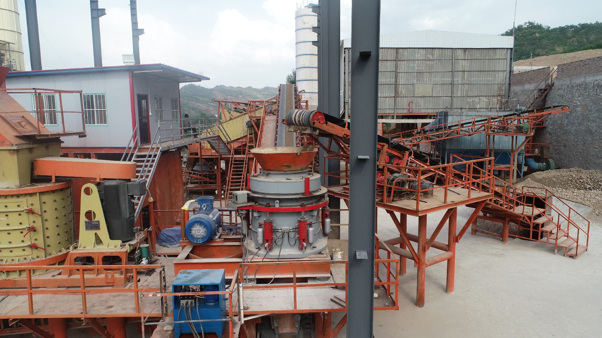The crushing principle of Hydraulic Cone Crusher is finished between fixed cone plate and movable cone plate. The cone crusher ’s motor drives the horizontal axis of the cocrusherthrough triangle belt and pulley, the horizontal axis drive the eccentric shaft bush to rotate through gear transmission. Theeccentric shaft drives the main shaft to make the movable cone plate swing at a regulated track from time to time, the materials are crushed due to constant pressed and crooked in the crushing cavity. The finished products are discharged from the discharging open