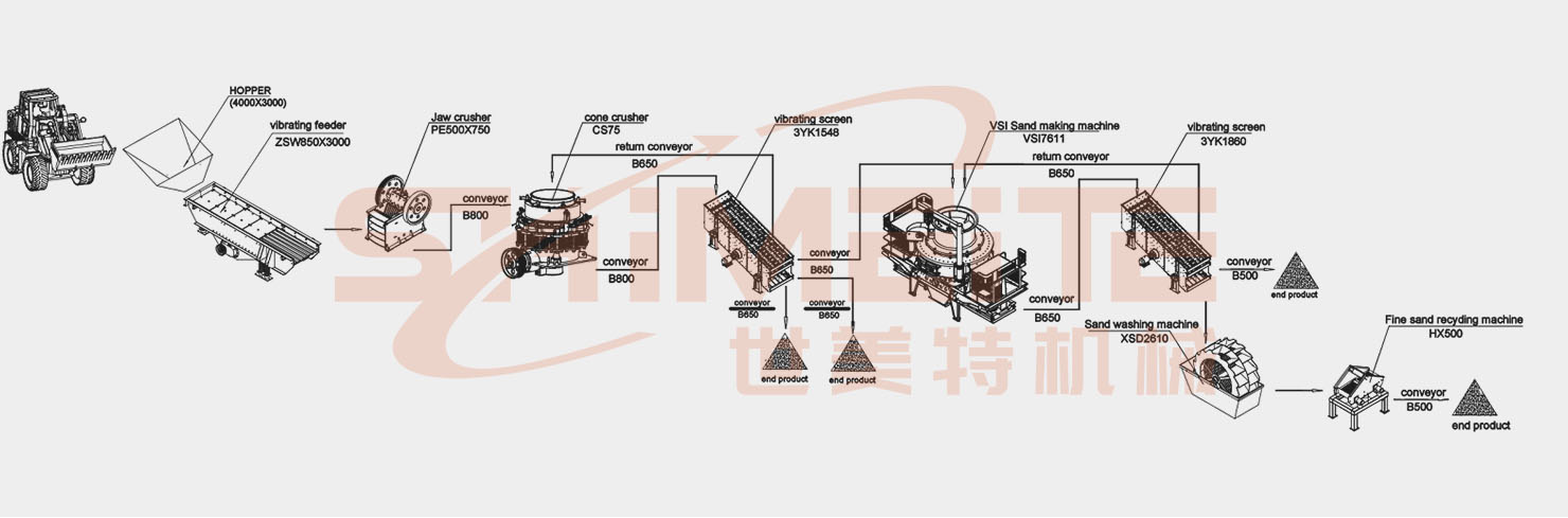 The complete stone production line adopts a two-stage crushing process, generally consisting of primary coarse crushing and secondary crushing equipment, depending on the required final particle size.