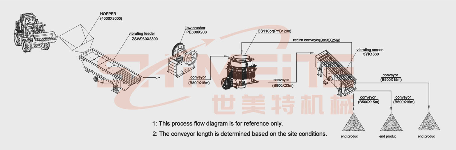 The 100-150 tons/hour stone crushing production line is a high-capacity standardized crushing system with two design forms: fixed and modular. It is mainly composed of LC3000×4000 hopper, ZSW960×3800 vibrating feeder, PE600×900 jaw crusher, CS110/PYB1200 cone crusher, 4YK1860 vibrating screen and a full set of large-specification belt conveyors. The model of fine crushing equipment can be flexibly switched to accurately match different stone processing needs.
