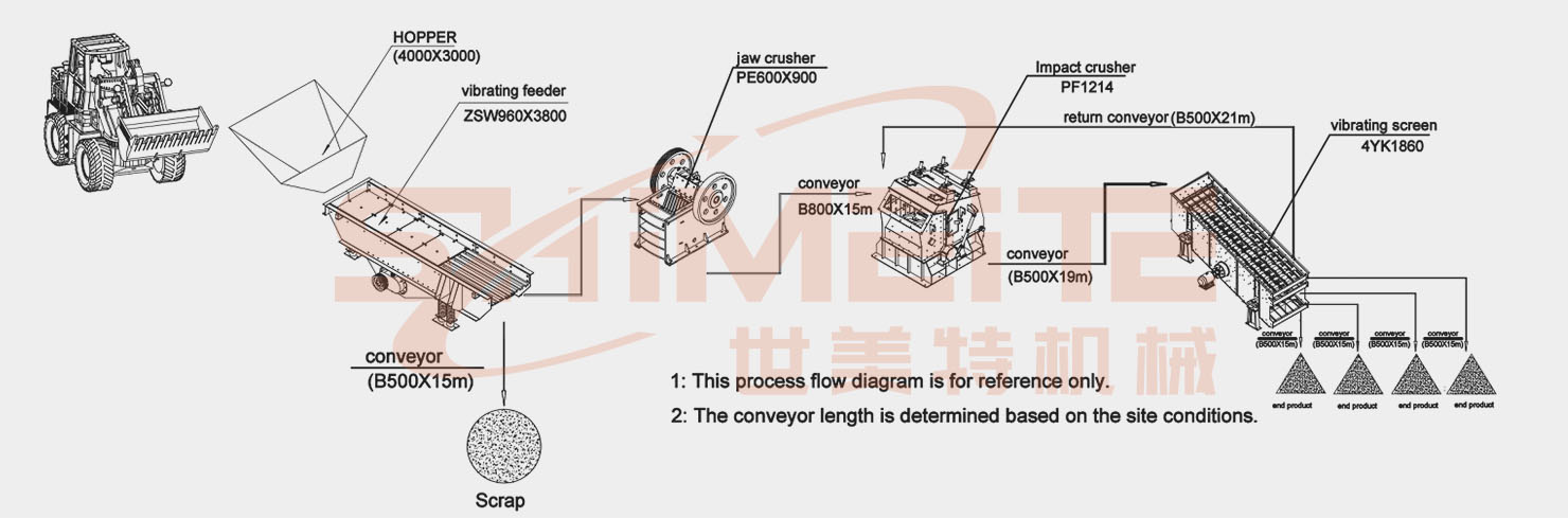 1. Two-stage process specially for soft stone processing: Adopting the two-stage crushing process of "jaw crusher for coarse crushing + impact crusher for fine crushing", it accurately adapts to the characteristics of medium and low hardness stone materials, with high crushing efficiency, low equipment wear, no raw material waste in the processing process and low comprehensive operating cost.